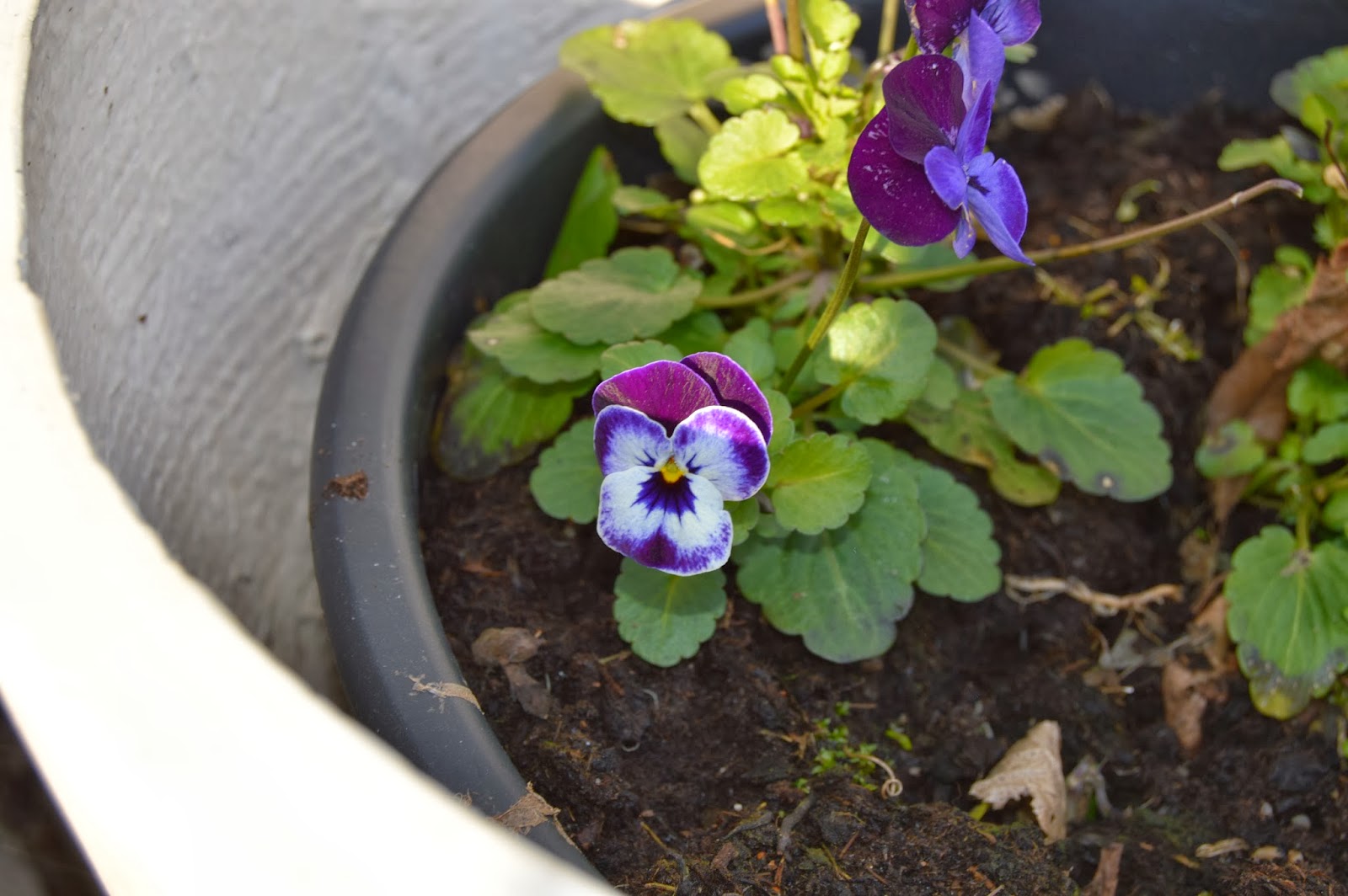 De blå hornvioler har jeg i næsten alle krukkerne, fordi jeg tabte en pose frø i såjorden sidste år. Det var jo ikke lige meningen, men det gør faktisk ikke noget.