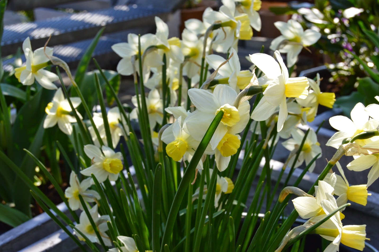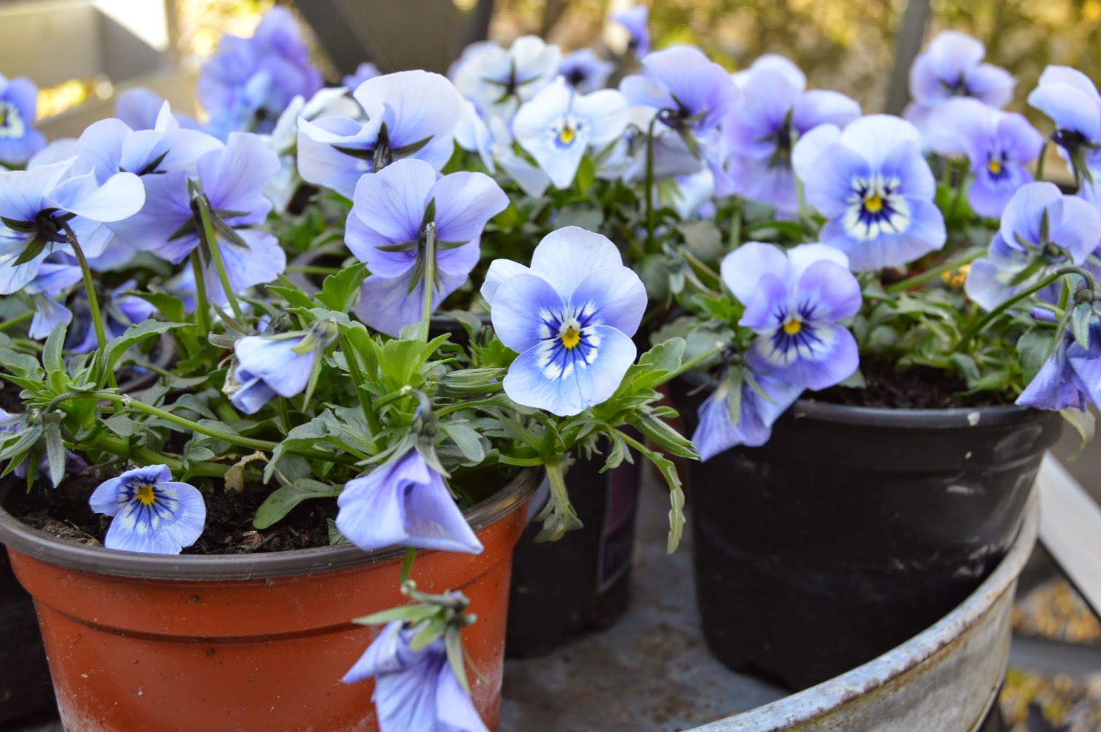 Hornviolerne står smukt sammen med sidste års "hjemmelavede" akelejer. De blå frø er tabt i plantejorden og er overalt i alle krukkerne - den hvide er selvsået fra potterne på sydvæggen. Jeg skal finde på noget nyt i år til disse potter - gerne en plante, der vælter ud over det hele. Hvis der er nogen, der har gode forslag, modtages de med kyshånd.